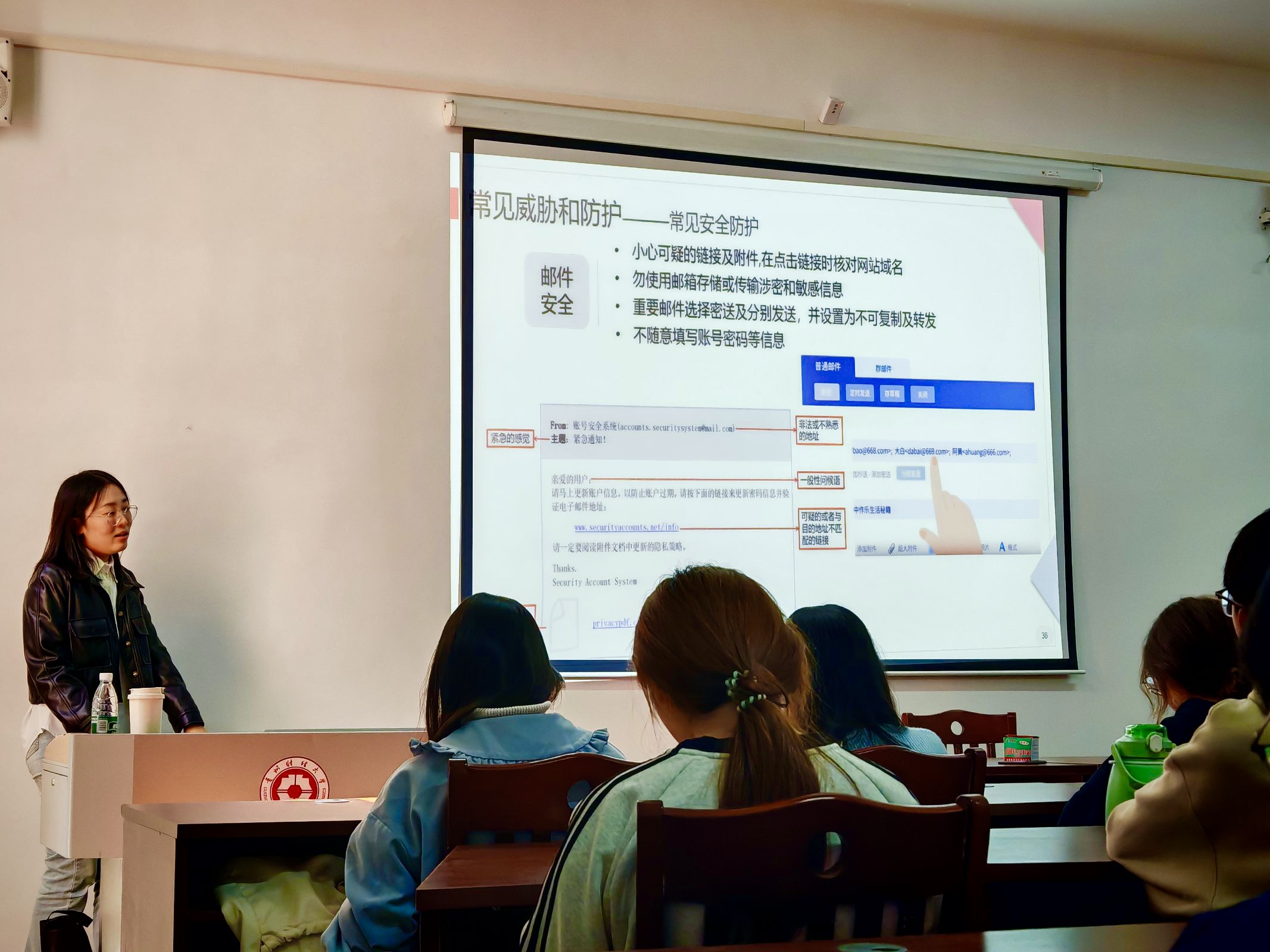 本次培训课程包括网络安全概述、数据安全、常见威胁和防护三个板块。在宣讲过程中,陈婉迪着重指出,国家以强制力保障公民、法人和组织的网络权利与安全,但与此同时,公民亦不得破坏网络安全,严禁利用网络损害国家安全、荣誉和利益,更不能开展任何违法犯罪活动。大学生置身于信息网络的潮流里,尤其需要提高警惕。同学们要注意防范个人信息的泄露,例如设置多样化且不重复的密码,对于带有个人信息的物品,务必在丢弃之前进行毁坏处理。当前,随着人工智能的兴起,AI换脸换声诈骗手段层出不穷。同学们不仅要自身提高防范意识,还要提醒身边的朋友和亲人,避免他们陷入网络诈骗的陷阱。