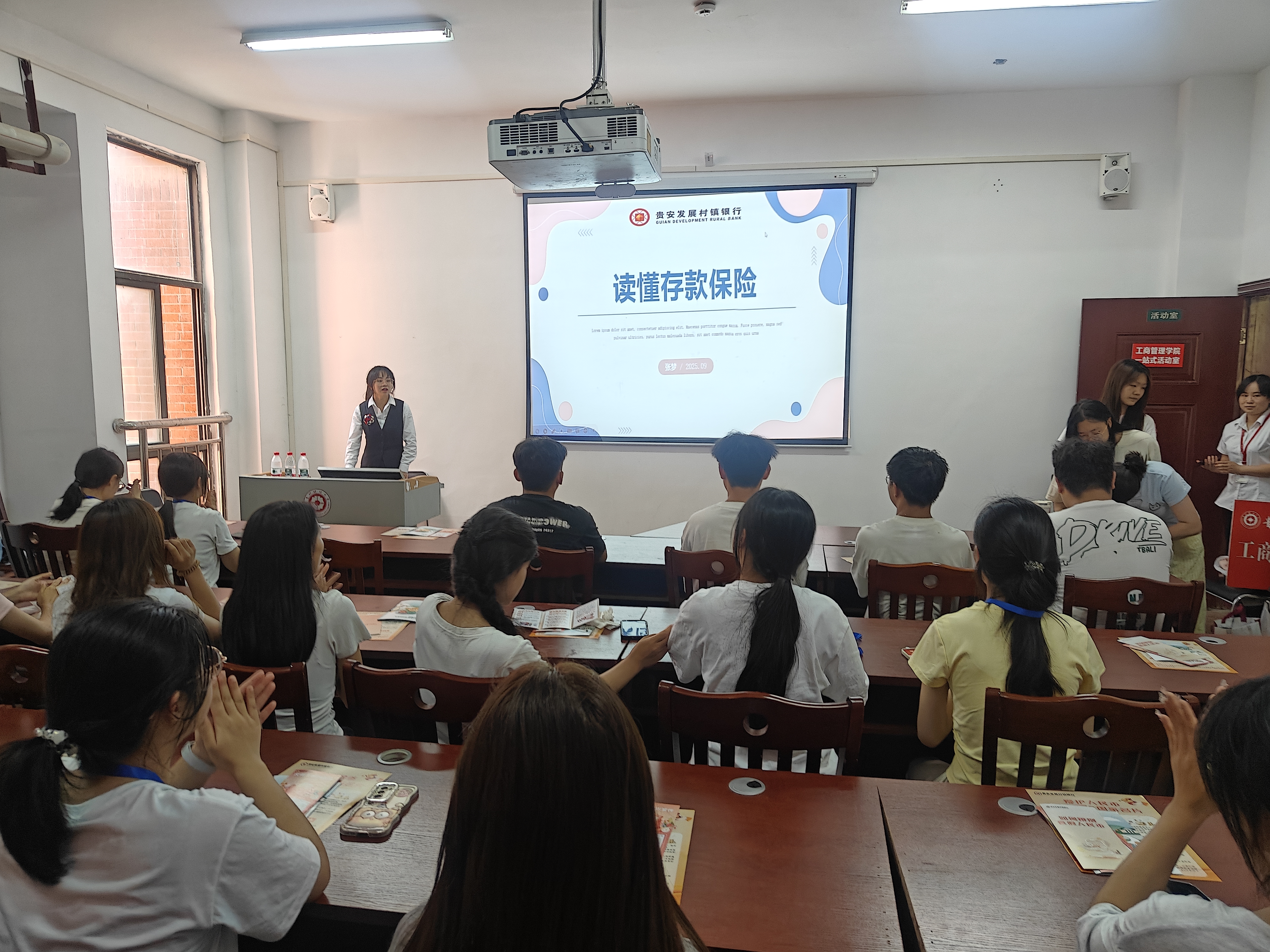 为普及反假货币知识,切实提升师生群体的反假货币意识与识别能力,工商管理学院“兵锋”校园志愿服务队联合贵安新区发展村镇银行,于2025年9月18日在翠竹苑三栋四楼“一站式”学生社区活动室开展“慧眼识假拒陷阱,共筑诚信反假网”主题宣讲会,本次活动共吸引四十余名师生参与,有效强化了同学们对假币风险的防范认知。