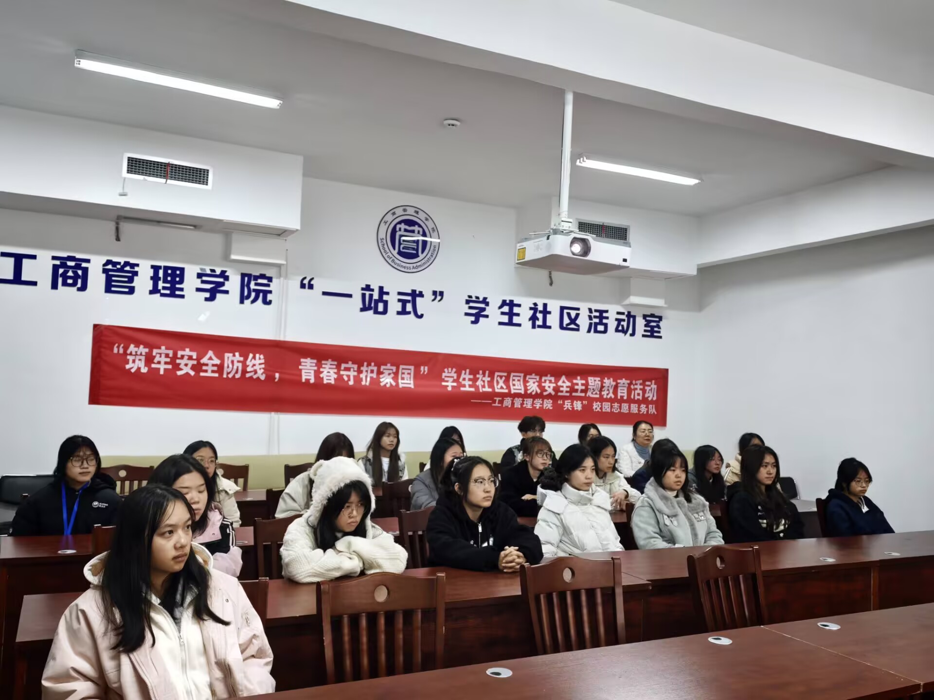 为深入贯彻落实总体国家安全观,响应国家新时代国家安全宣传教育号召,切实提升大学生国家安全意识与风险防范能力,2025年11月18日下午,工商管理学院“兵锋”校园志愿服务队在翠竹苑三栋四楼活动室举办“筑牢安全防线,青春守护家国”学生社区国家安全主题宣讲活动。