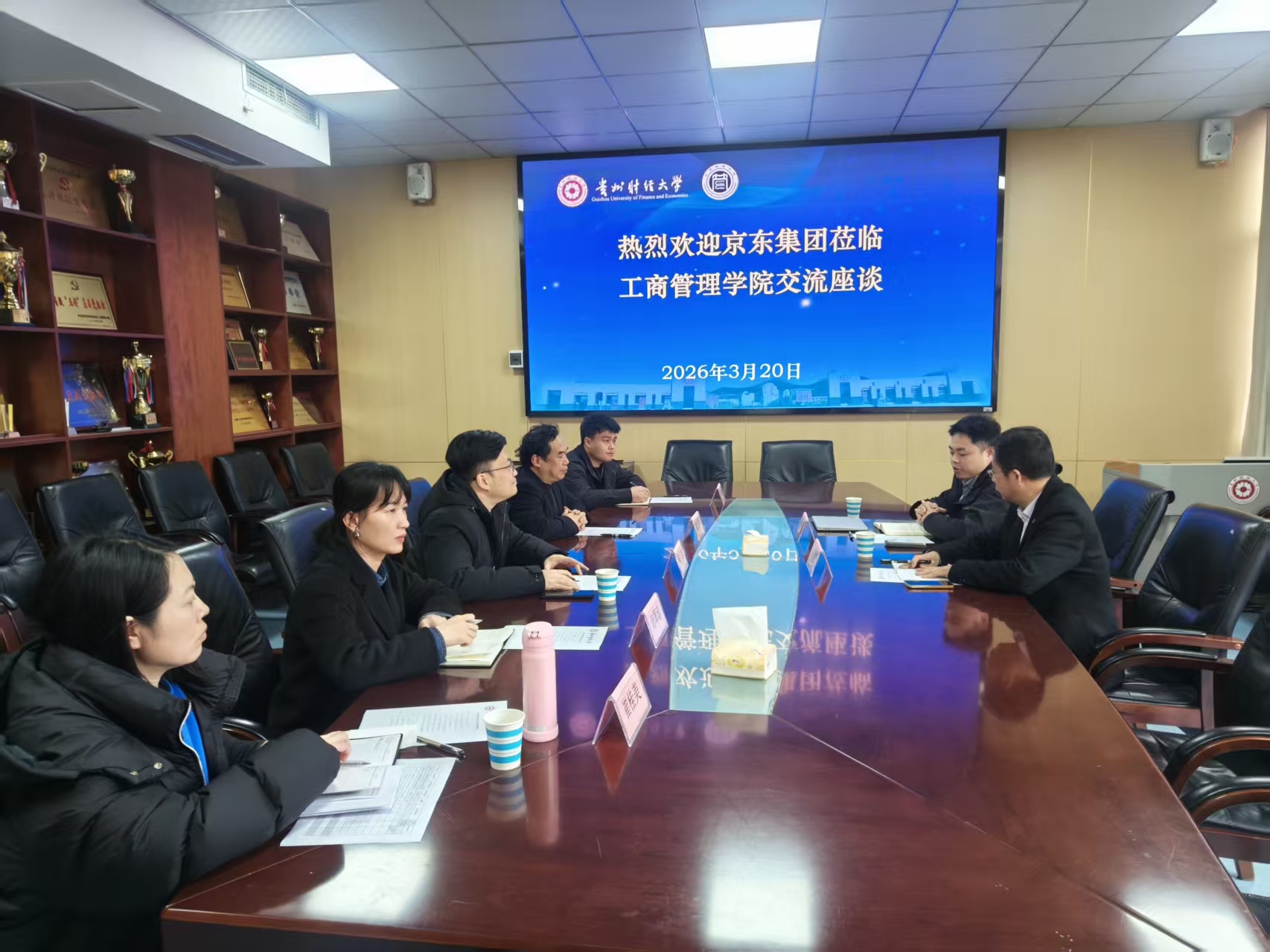 为深化产教融合、拓宽学生实习就业渠道,2026年3月20日,贵州财经大学工商管理学院特邀京东集团到访,在崇德楼427会议室召开实习就业合作专项座谈交流会。工商管理学院党委副书记何瑞、副院长胡北明及辅导员,京东集团校企合作部项目策划经理冷俊熙、拓展经理杨文辉共同参会。