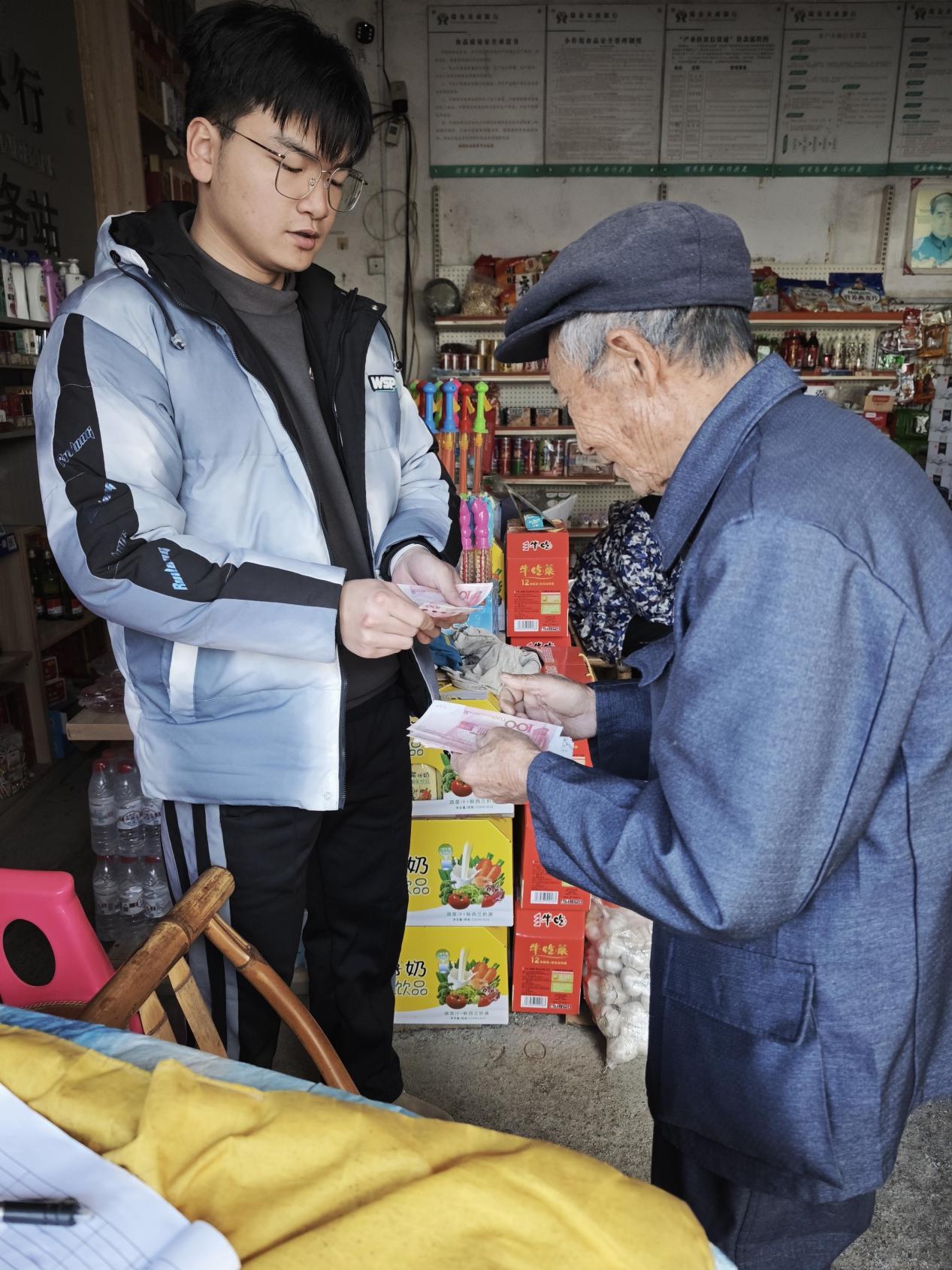 寒假期间,为助力农村助农取款服务的高效运行,我响应号召,以志愿者的身份在家乡农村的助农取款网点协助操作POS机,为农村退休老人提供现场服务,成为连接金融系统与乡村老人的“温暖纽带”。通过参与“助农取款网点”相关工作,服务前移至村口、村委会,实现农村老人足不出村即可便捷快速地领取养老金,真正实现了“养老金领取不出村,困难老人服务送上门”。