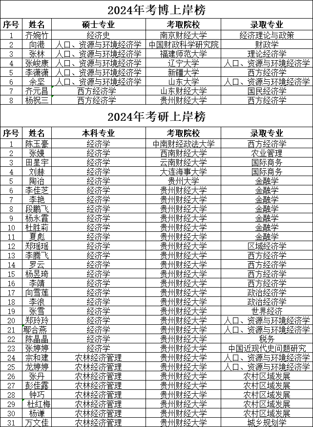 贵州财经大学经济学院2024届毕业生考研考博光荣榜