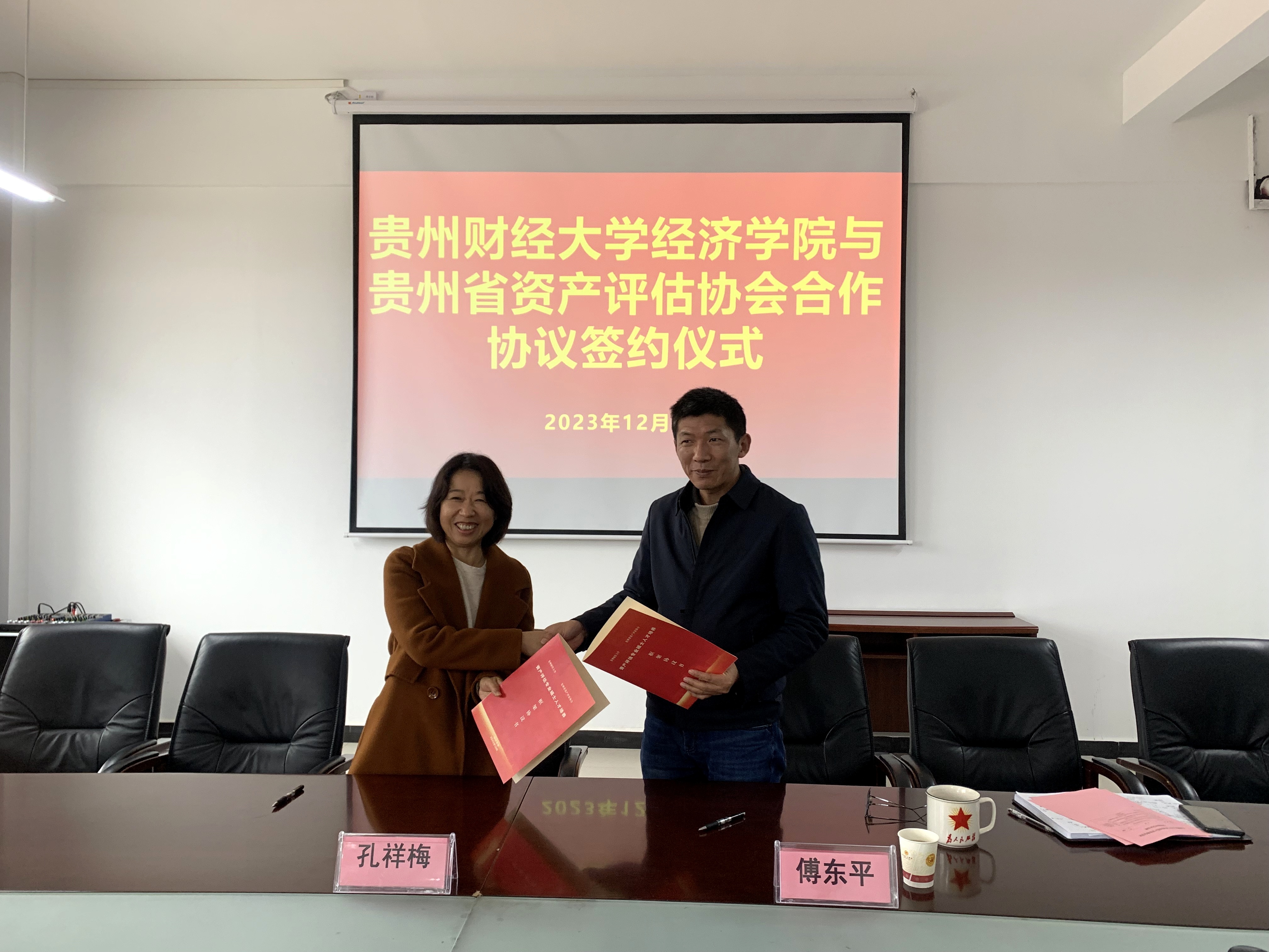 傅东平教授代表经济学院与贵州省资产评估协会签署了《贵州财经大学经济学院和贵州省资产评估协会资产评估专业硕士人才培养框架协议书》,并与贵州省资产评估协会11家理事单位负责人签署了校外实习基地协议。