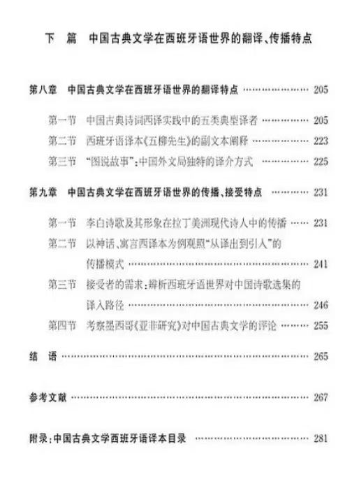 该专著属于“十四五”时期国家重点出版物出版专项规划项目“中华译学馆·中华翻译研究文库”。 该书从译文、译本、译者、出版者四个方面梳厘了“中国诗歌通选”“《诗经》《楚辞》”“汉魏六朝诗”“唐诗”“宋元明清诗词散曲”“经典故事”“古典散文”“古典戏曲”与“古典小说”在西班牙语世界的传播现状,勾勒了中国古诗、中国古文在西语国家的译介版图,剖析、比照了经典译文;挖掘了经典译本并分析译本的生成过程;描述了突出译者的成长历程、学缘结构以及译作;对比译入、译出的对象选择、译介方式与传播路径,深入分析了重要译出机构。