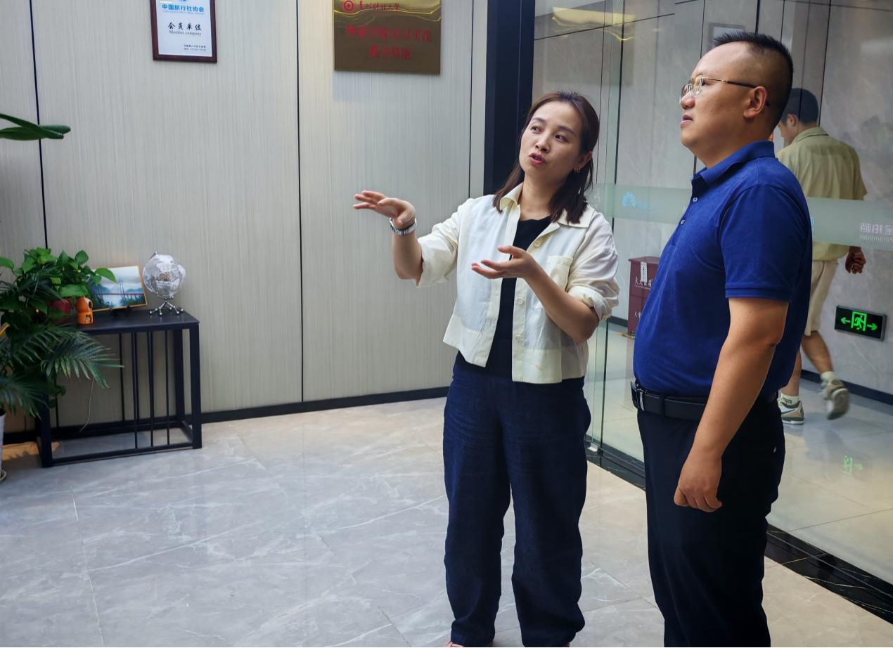 在黄康乐、欧阳海芳的陪同下,一行人参观了学生实习的工作环境,详细了解实习岗位职责及工作内容。走访过程中,王钊与实习生们亲切交谈,给予了同学们宝贵的学习建议。