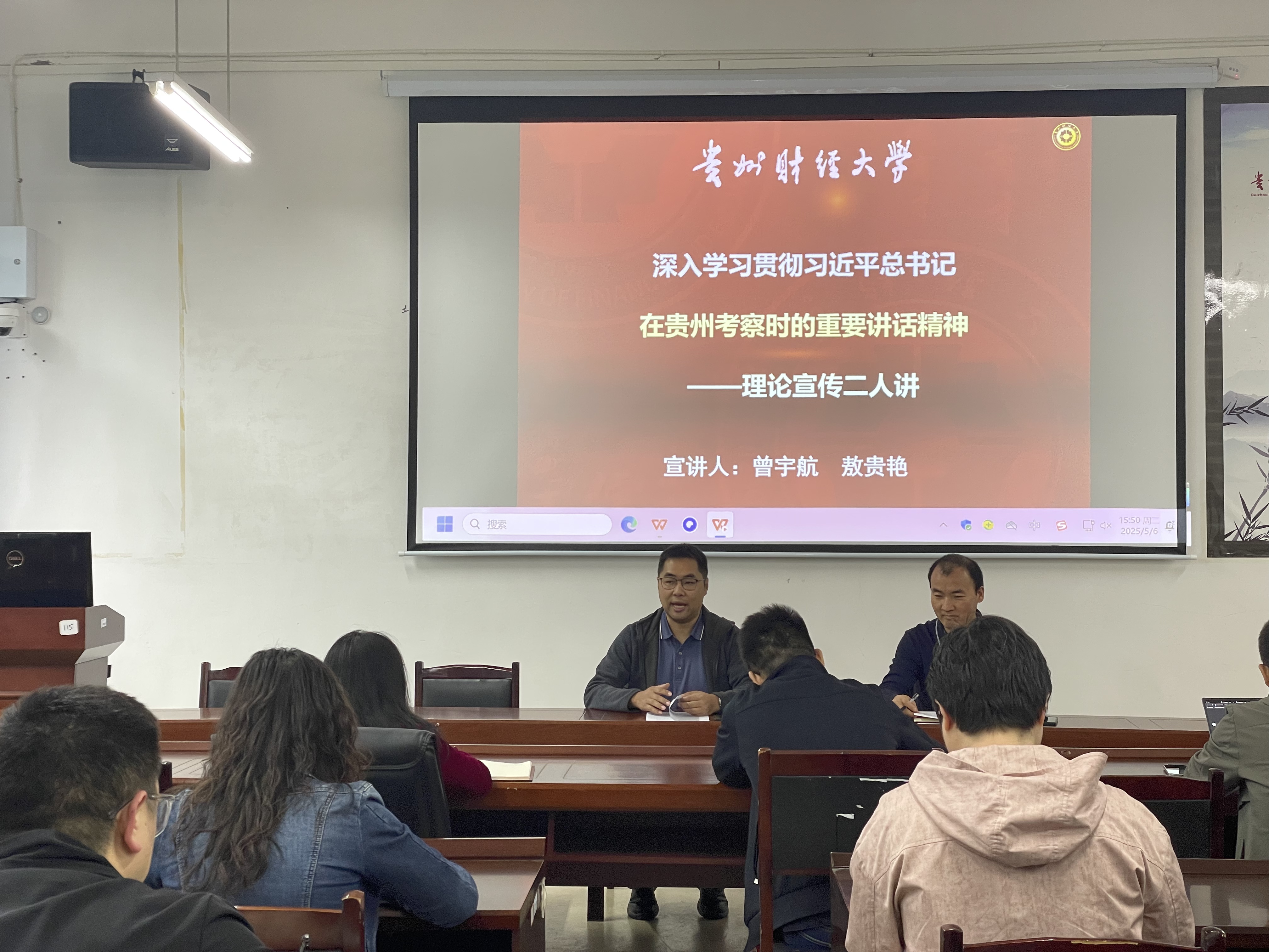 5月6日,以“深入学习贯彻习近平总书记在贵州考察时的重要讲话精神”为主题的“理论宣传二人讲”活动在进德楼鼎新讲堂顺利举行。活动由研究生院院长曾宇航教授和招生就业科敖贵艳副教授主讲,研究生院20余位教师参加了此次宣讲会。